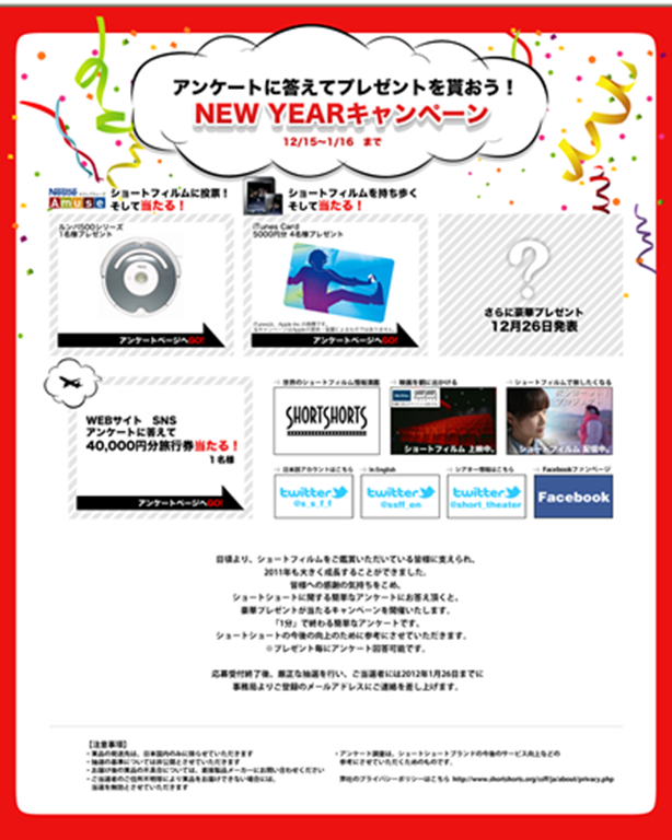 2.応募方法 キャンペーンオフィシャルサイトにアクセス頂き、指定のアンケートにお答えください。 キャンペーンオフィシャルサイト:http://www.shortshorts.org/campaign2011/