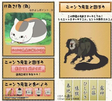 『ニャンコ先生と食べよう』コーナーにある、ニャンコ先生の好物であるイカ焼きや饅頭などのアイテムボタンを押すと、食べ物にあわせた「ニャンコ先生」の反応が見られます。