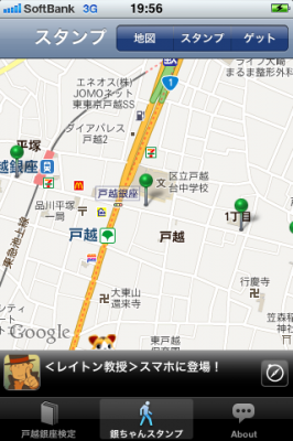 ・ 銀ちゃんスタンプラリー: 戸越銀座の人気マスコットキャラクター銀ちゃん(本名 戸越銀次郎)のフィギュアが、戸越銀座商店街に8体設置されています。アプリの機能を使って、それぞれの銀ちゃんに用意されているバーコードを読み込むと、デジタルスタンプが現れます。