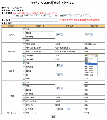 建設・海洋工事などの現場向け局地予報サービス「安全建設気象モバイルKIYOMASA:NETIS KT-100110」を手掛ける、株式会社ライフビジネスウェザー(本社:東京都中央区、代表者:代表取締役 石川勝敏)は、異常気象発生時における現場の過去の気象データや作業判断時に発表されていた降水、風速などの予測値を、作業終了後の安全施工/履行証明書として帳票出力できるサービス「エビデンス帳票出力サービス」をリリース致しました。弊社は、「安全建設気象モバイルKIYOMASA」サービスの中で、現場単位の気象条件を、1kmメッシュまた10分刻みの細かさで予測しており、延べ全国2000以上の現場への局地気象情報の提供実績があります。作業員の安全性確保や作業の効率性追求のため、降水や強風、異常高温、高波などが予想されている場合の作業中止判断基準として、主にご利用いただいておりますが、リアルタイムでの予測値だけでなく、過去の予報履歴を提供するサービスを始めたのが、今回の最大のポイントです。ゲリラ豪雨や強風などで、現場で実際に作業中止に至った場合、その当時どのような気象状況が予測されていたか、帳票形式でご提供いたします。