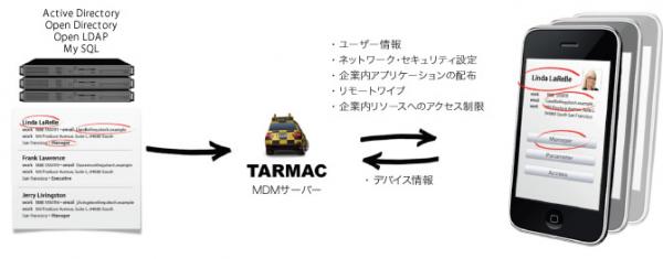 このモバイルデバイスマネージメントシステム「TARMAC」を管理システムの中核に備えることで、今まで困難だった管理・運用の問題を解決し、組織内での一括導入を現実のものにします。