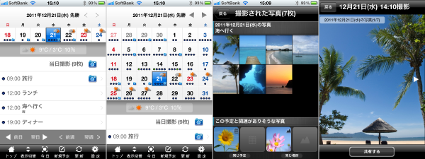 フォトログ機能はスケジュールとiPhoneで撮影した写真を連携させて表示することができる機能です。スケジュールと撮影日を連動させるため、その時の思い出写真を確認したり、メールで友達と共有することも可能です。
