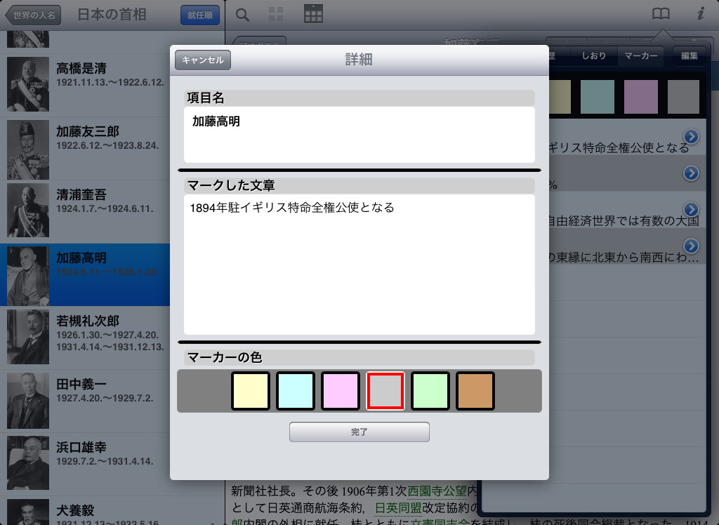 ●蛍光ペンを使うように重要箇所に色をつけるマーカー機能(*要iOS3.2以降)