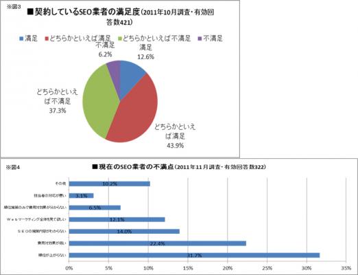 ユーザーに具体的な不満点を挙げて頂いた。「順位が上がらない」という不満が31.7%と最も多く、「費用対効果が低い」(22.4%)という回答が続く結果となった。また、「SEOの施策内容がわからない」や、「Webマーケティング全体を見て欲しい」など、SEO業者に求める要望が変化していることが伺える。※図4