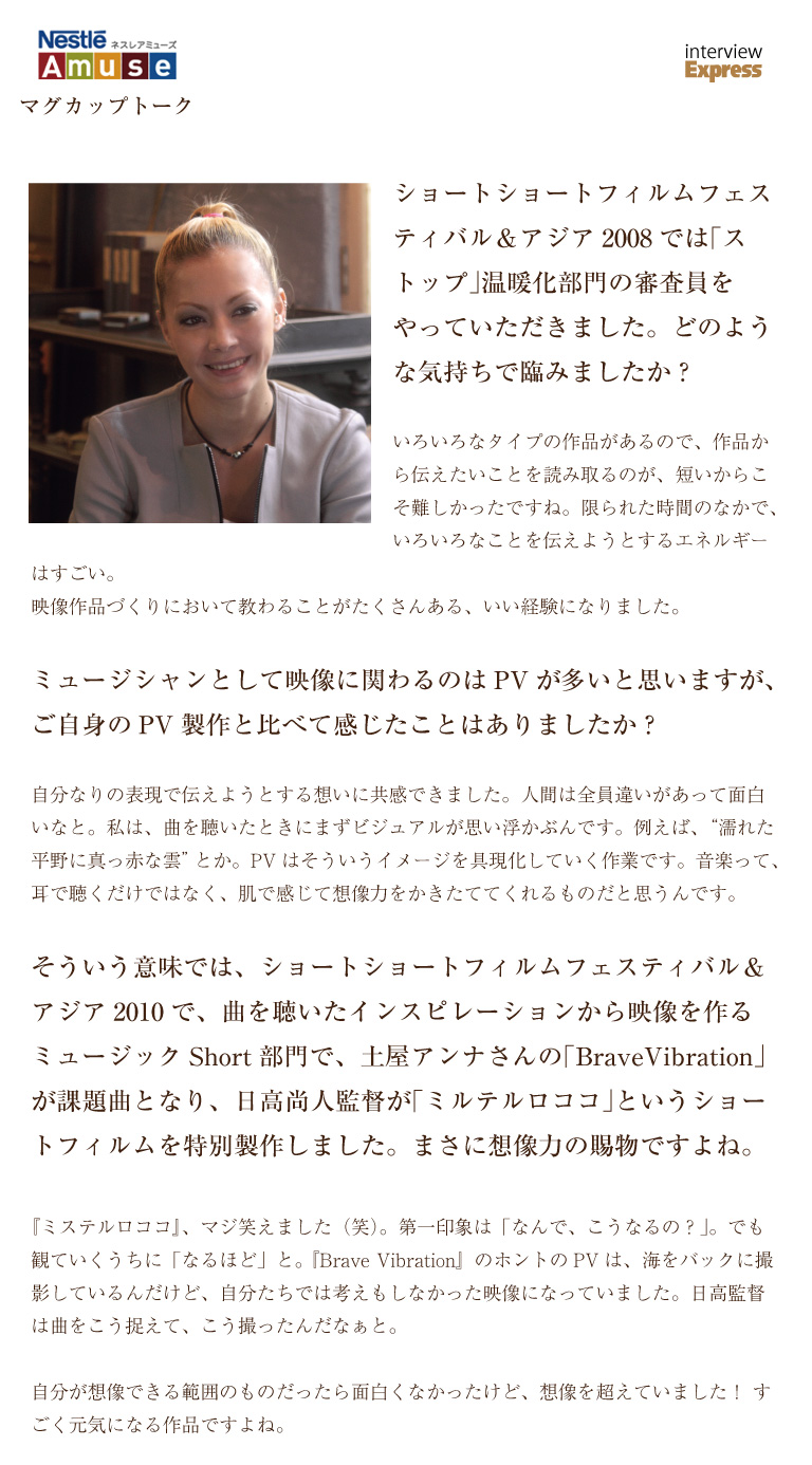 インタビューは、ネスレ日本株式会社が手がけるエンタテインメントサイト「ネスレアミューズ」内でショートフィルムを楽しんでもらうためのコンテンツ「Nestlé Amuse × ShortShorts」内の「コーヒーと映画」をテーマに著名人を迎えたコンテンツ“マグカップトーク”と連動しています。土屋さんは、SSFF & ASIAにも馴染みが深く、アグレッシブにロックを歌う姿と飾らない振る舞いに、憧れを抱く人も多いモデル/ミュージシャン。インタビューでは、コーヒーと映画にまつわる話以外にも、PVなどのショートフィルムに込められた想いから、クリエイティブの本質と彼女の生き方に迫ります。