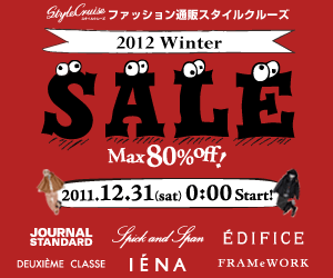 ファッション通販 スタイルクルーズは、12月31日(土)より冬のセール「Style Cruise 2012 Winter SALE」を店舗、他のファッション通販サイトに先駆け開催いたします。JOURNAL STANDARD、Spick and Span、IENA、EDIFICEなど計23ショップのウェアから小物まで、ワードローブに取り揃えたいアイテムが最大で80%OFFになります。
