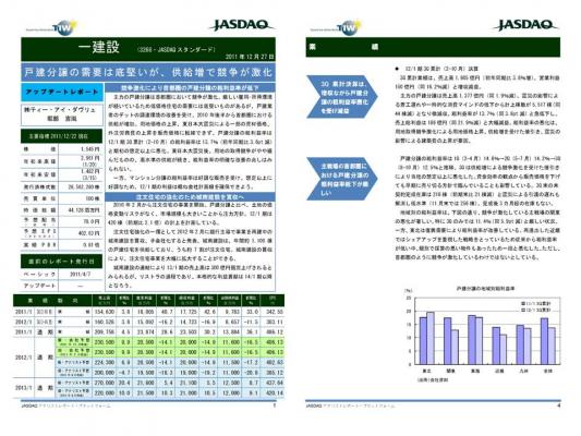 主力の戸建分譲は首都圏において競争が激化。厳しい雇用・所得環境が続いているため低価格住宅の需要には底堅いものがあるが,戸建業者のデットの調達環境の改善を受け,2010年後半から首都圏における供給が増加。用地価格の上昇,東日本大震災による一部の資材価格,外注労務費の上昇を・・・