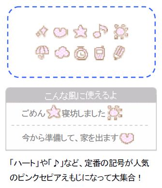 コンテンツ内容:「ハート」や「♪」など、定番の記号が人気のピンクセピアえもじになって大集合!