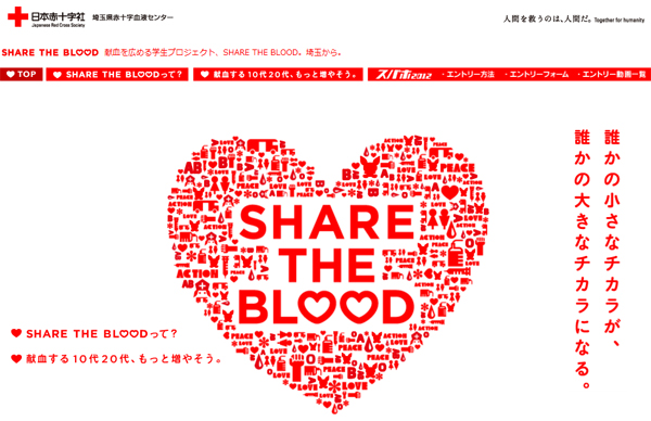 埼玉県赤十字血液センターでは、埼玉の高校生・大学生に献血を広める活動、「SHARE THE BLOOD(シェア・ザ・ブラッド)」というプロジェクトを開始しました。これは全国的に課題となっている「若年層の献血離れ※」に対する対策の一環です。埼玉県は高校生の献血者数は日本一(平成19年から4年連続)という、高い意識を持っています。そこで、10代20代の彼らを主人公とした活動を通し、献血の意味を確認し、互いに呼びかけ合ってもらう、そんな成果をめざしています。