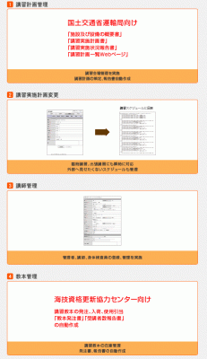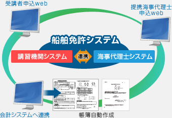 「船舶免許システム」の提供により、これまでは電話での講習申込が大半であったが、インターネット社会になり、ホームページからの講習申込と様変わりしてきている。このような背景も有り、従来の手作業だった講習業務をホームページからの講習申込受付から各種書類作成やデータ管理、登録更新講習等実施機関と海事代理士の連携をシームレスにシステム上で実現。登録更新講習等実施機関が、国土交通省運輸局へ提出する各種報告書や海技資格更新協力センターへ提出する教本発注や報告書も自動作成でき、登録更新講習等実施機関及び海事代理士の作業の大幅な事務効率化を図ることができる。