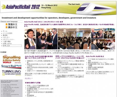 株式会社グローバル インフォメーションでは、皆様の利便性を図る為に、日本語、韓国語、中国語で「Asia Pacific Rail 2012」の情報を提供するとともに、会議の参加のお申し込みを承っております。