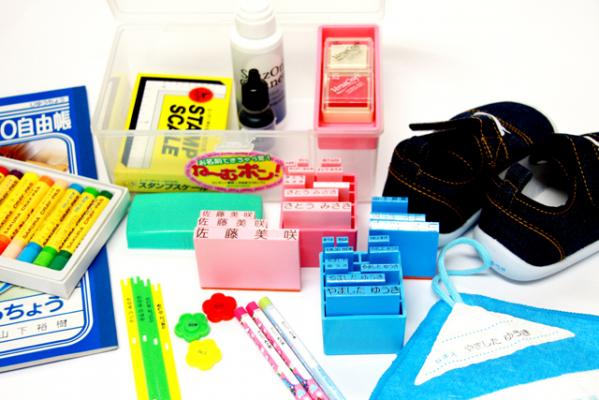ねーむポンの特長は、さまざまな文具のサイズにあったスタンプを用意し、例えばノート、教科書などの紙製品、線引きや計算棒、おはじきなどのプラスチック製品、うわばきや帽子などの布製品など、入園や入学時に必要になるほとんどの用具にスタンプができること。