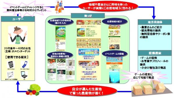 2010年6月のサービス開始以来「ゲーミフィケーション」の理論を活用し、3万5千個以上の作物を農家さんから直接ご自宅にお届けしています。現在au公式サイト、スマートフォン、光iフレームをプラットフォームを拡充し、5万人以上のお客さまにご利用いただいております。定期的に変わる各地域のスペシャルコンテンツを通じて、仮想(バーチャル)農園で野菜や果物、牛などを育て、収穫・搾乳すると、本物の作物や乳製品が自宅に届くという画期的なサービスとしてお楽しみいただいています。お客さまが実際にその地域に足を運ぶ機会を創出、「地域の作物収穫」「地域生活」をリアルに体験できるこれまでにないソーシャルサービスを提供しています。