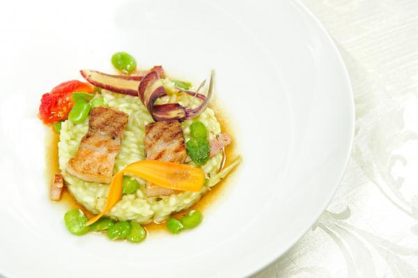 黒豚を使ったグリーンピースとベーコンのリゾット