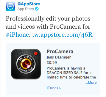 AppleはさらにTwitterで:iPhone用のプロカメラを使ってプロなみの写真やビデオ編集をしてください:http://tw.appstore.com/46R、とツイートしています。