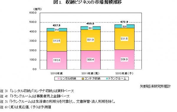 本調査における「収納ビジネス」市場とは、自宅やオフィス以外にお金を支払って非商品を預ける、もしくは保管するスペースを賃借するビジネスを「収納ビジネス」市場とする。倉庫事業者が展開している「トランクルーム」(うち生活者向けサービスのみ、文書保管及び法人利用除く)、不動産事業者などが展開している「レンタル収納スペース」「コンテナ収納」などを対象としている。金融機関が提供する貸金庫や駅などに設置してあるコインロッカーは除いている。