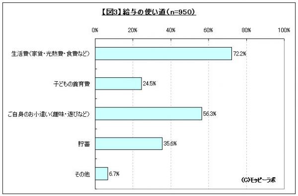 20~59歳の既婚女性のうちアルバイト・パート経験のある人に対して「給与の使い道」についてモバイルリサーチで聞いたところ、1位「生活費」(72.2%)、2位「ご自身のお小遣い」(56.3%)、3位「子どもの養育費」(24.5%)という結果となった(図3参照)。大多数の主婦がアルバイト・パート代を家庭の生活費の足しにしていることは容易に想像できるが、意外にも「貯蓄」より「自分のお小遣い」を優先しているという事実が発覚した。毎日「主婦」という仕事をこなしつつ、さらにアルバイト・パートとして働きに出るからには、その「ご褒美」として自分で稼いだお金は自分で自由に使いたいという心理なのかもしれない。