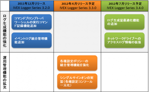 この度アイベクスでは、2012年の製品リリース計画を以下の通り発表しました。本バージョンアップにより、段階的にログ生成機能の強化並びに運用管理機能の充実を図っていきます。