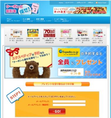 FAZER株式会社は、2012年2月1日より、クーポンと割引を探せ!内の世界最大のオンライン旅行サイト エクスペディア キャンペーン用特設ページ(http://www.bjam.jp/expedia-cp/)経由で、ホテル予約、ツアー予約をした全員へ最大2000円分のAmazon(R)ギフト券をプレゼントするキャンペーンを開始いたします。クーポンと割引を探せ!の旅行カテゴリー内で、世界最大のオンライン旅行サイト エクスペディアのページ閲覧数が最も多かったため、今回のキャンペーンを開催することとなりました。クーポンと割引を探せ!の特設ページへアクセスし、メールアドレスを入力した後エクスペディアで予約された方全員に、予約金額に応じてAmazon(R)ギフト券をプレゼントいたします。