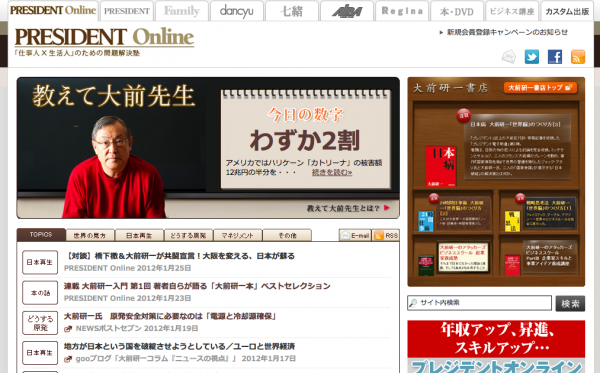 経営思想家・大前研一氏のすべてを学ぶことができるウエブサイト「教えて大前先生」( http://president.jp/ohmae/ )を、2012年1月23日に開設しました。名著『企業参謀』を筆頭とする大前氏の著作、福島原発事故での迅速な提言で知られる行動と発言、そのすべてを一元化して知り、学ぶことができるポータルサイトです。