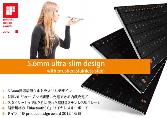 Rapoo-E6300は世界最薄※、軽量のウルトラスリムデザイン。(※2012年1月現在)厚さたったの5.6mmステンレススチールのフレームを採用したボディは、耐久性に優れ重量は155gと一般的なキーボードの約半分以下で持ち運びにとても便利です。乾電池不要の充電式リチームポリマー電池内蔵。付属のUSBケーブルを使えば、フル充電約2時間で約1ケ月使用可能な省エネモデル。