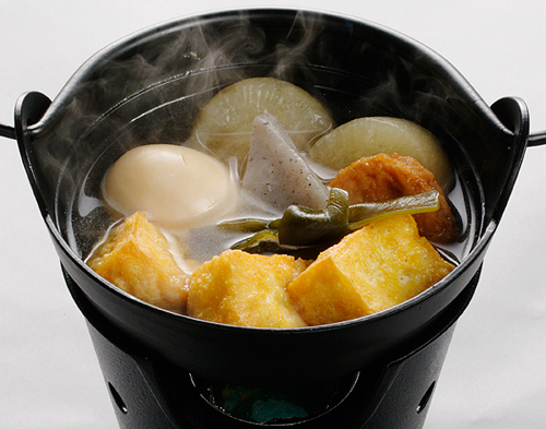 大根、昆布、玉子、こんにゃく、厚揚げ、薩摩揚げの6種類の具材がはいったおでんメニューです。熱々で召し上がって頂けるように、卓上で仕上げます。寒い季節に体の芯からあたたまる2月限定メニューです。