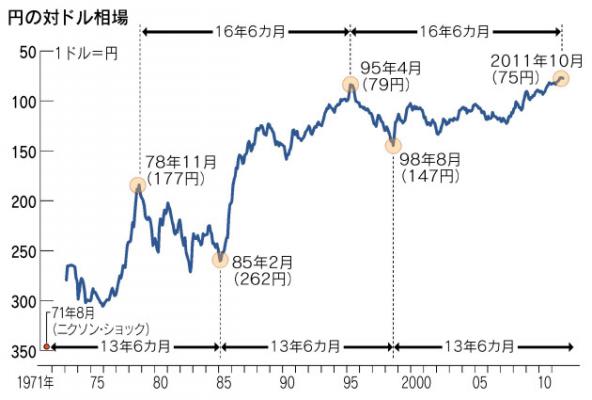 1971年12月に固定相場制のもとで1ドル=360円から1ドル=308円に切り上げられて以来、