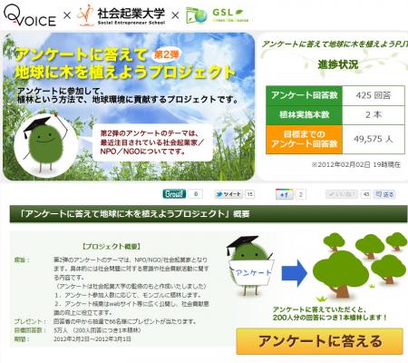 ホームページの環境認証サービス【グリーンサイトライセンス(以下GSL)】(※1)とアンケートプラットフォーム【Q-VOICE】(※2)は社会起業大学(※3)の協力を得て、2012年2月2日(木)より共同で『アンケートに答えて地球に木を植えようプロジェクト』第2弾を開始します。