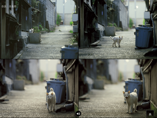 掲載された46枚の写真には、写真展で写真家が来場者に1枚1枚、作品を解説するギャラリートークイベントのように、写真家本人の声で撮影時の様子やそのネコの思いでなどの解説が付いています。写真だけではわからないエピソードなどを聞くことにより、より写真を楽しむことができます。(音声オフモードも選択可能)