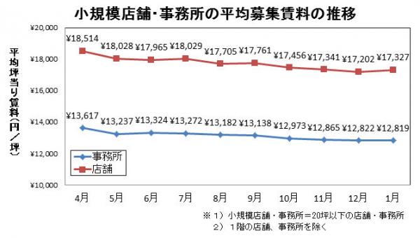しかし、長引く景気停滞の影響で、1月は、小規模事務所の募集賃料が前月比0.2%下落し、これで前年7月以降、7ヶ月連続で下落が続いています。