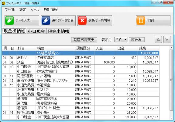 「かんたん商人 現金出納帳4」は、毎日の取引内容を、すぐに現金出納帳・小口現金出納帳・預金出納帳に記入、作成できるソフトです。
