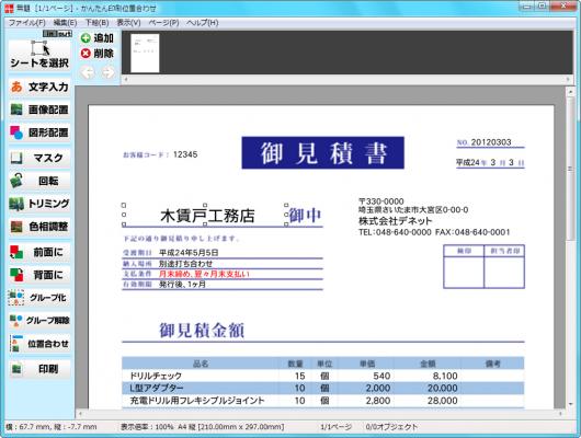 「かんたん印刷位置合わせ」は、市販の納品書・請求書用紙や伝票などレイアウトが決まっている 定型用紙に文字・画像などを配置して印刷できるソフトです。
