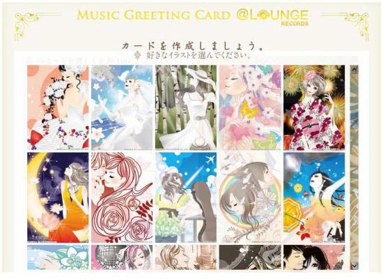 カードで選べる素材には、イラストレーターMEGによるカラフルで美麗な100種類ものイラスト、音楽は雑貨店などを中心に人気のタイトルをリリースしているレーベル、@LOUNGE RECORDSが提供。ショパン、モーツァルトなどのクラシック楽曲をモチーフにしたスタイリッシュなオリジナル楽曲や、誕生日の人向けには、ボサノバ、ロック、JAZZ、スカ、沖縄民謡風など12種類ものバージョン違いによる「ハッピーバースデー」などなど、バラエティーに富んだ素材が用意されています。