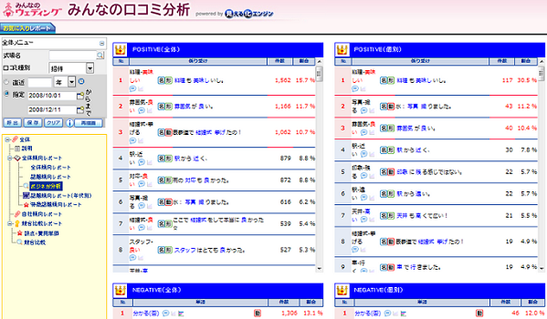 「みんなの口コミ分析」は、株式会社プラスアルファ・コンサルティングが開発したテキストマイニングシステム『見える化エンジン』を、みんなのウェディング用にカスタマイズし、全体傾向や、話題傾向が可視化されるほか、「ポジティブワード」「ネガティブワード」の比較分析、年代別の傾向などを分析することができ、事業の成長や改善に役立てていただけるツールとなっております。