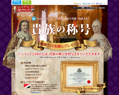 『もしもグランプリ』の開催と並行して、本日(16日)より『貴殿も春から男爵・男爵夫人!貴族の称号プレゼント』と題して、抽選で10名様にシーランド公国公式の「男爵、男爵夫人の称号」をプレゼントする、『もしもグランプリ開幕戦御礼キャンペーン』を行います。