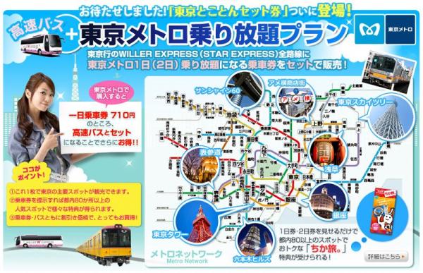 移動ポータルサイトを運営するWILLER TRAVEL株式会社(http://travel.willer.co.jp/、代表取締役:村瀬 茂高、以下ウィラートラベル)は、東京メトロ(代表取締役:奥 義光)との提携により、各方面から東京までの高速ツアーバス・ウィラーエクスプレスに東京メトロの乗り放題券をセットにした「東京とことんセット券」を2月20日より販売を開始します。