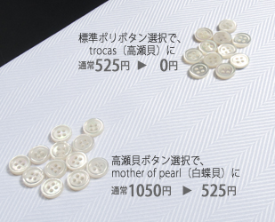 標準のポリエステルボタンを選択で、オプション価格525円の高瀬貝ボタンが無料で付きます。