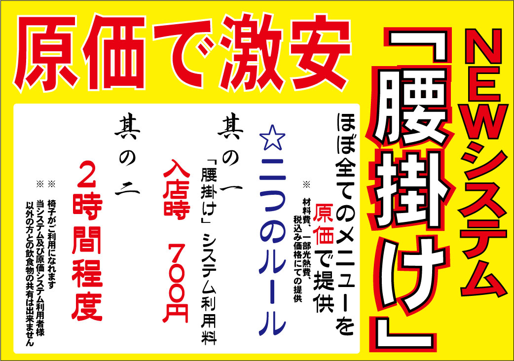 「原価」システムとは、入店時にシステム利用料¥500を支払い、立ち飲み、立ち食いする事により、ほぼ原価(材料光熱費等 + 消費税)での飲食が出来るサービスで、コンビニ同等、またはそれ以下の低価格による商品の提供を行っています。