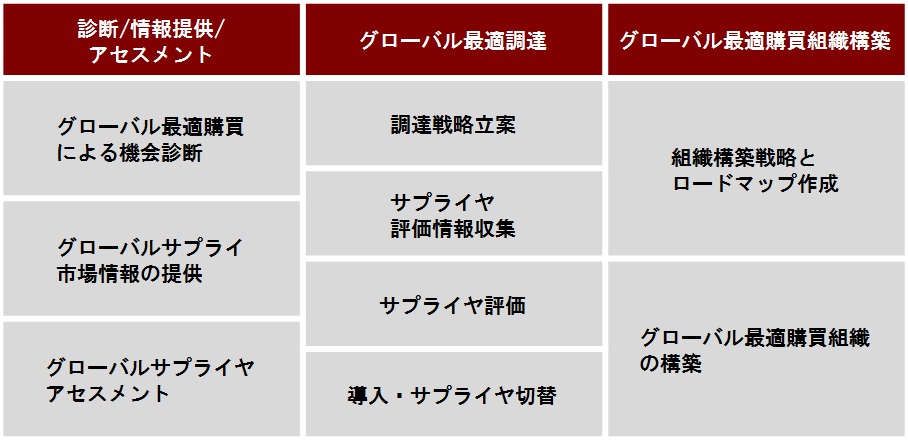 当社では、こうしたグローバル最適購買の必要の高まりとお客様企業における課題の増大を受け、これまで様々な規模・業種・状況のお客様のグローバル最適購買実現の支援により培ってきたノウハウとグローバルのサービスネットワークを体系化し、お客様企業のグローバル最適購買実現サービスの提供を開始しました。グローバル最適購買実現サービスは、(1)グローバル最適購買による機会診断、特定のサプライ市場や品質管理、CSR調達、リスクマネジメントに向けたサプライヤ監査などの診断や情報提供、(2)現地のサプライ市場、サプライヤに精通した現地コンサルタントを活用しグローバル最適調達を代行するグローバル最適調達サービス、(3)各地域における調達拠点や現地スタッフの確保や現地サプライヤとの直接取引に向けた納期管理、検査、品質管理体制の構築などグローバルサプライチェーンマネジメントの確立をハンズオンで行うグローバル最適購買組織構築サービスの三つの支援メニューで構成され、お客様のニーズやグローバル経営の進展度に応じた形で必要な支援だけを切り出して提供するものです。