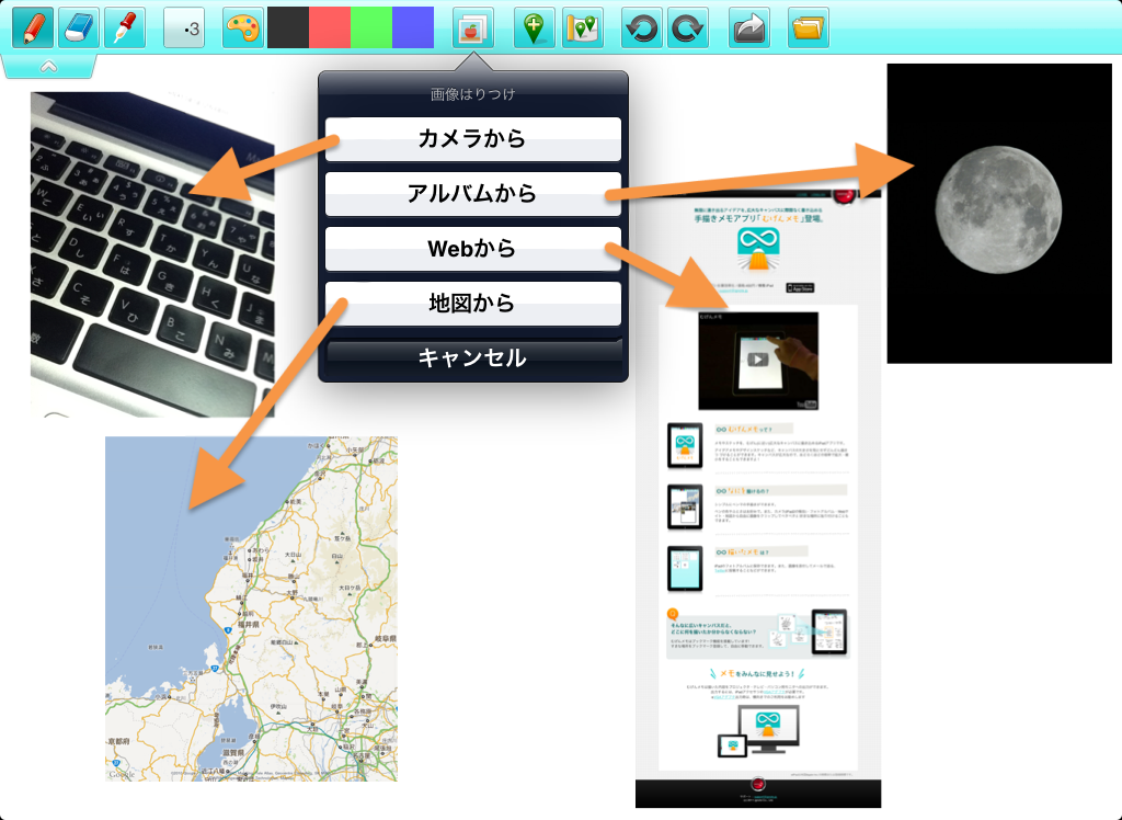 シンプルな中にも編集機能は充実しており、ペンによる手描きの他に、 フォトアルバム・カメラ(搭載端末のみ)・Webページ・地図を画像として貼りつけ 注釈を書き込むなどの操作ができます。
