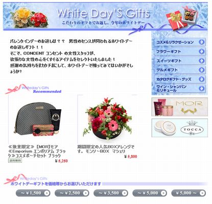 ホワイトデー特集は、「コスメ&リラクゼーション」「フラワーギフト」「スイーツギフト」「グルメギフト」「カタログギフト・グッズ」「ワイン・シャンパン&リキュール」の6カテゴリで構成されています。