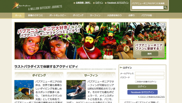 日本から直行便で6時間半で行くことができるプリミティブな世界、それがパプアニューギニアです。サーフィン、ダイビングだけでなく、トレッキングやフィッシング、バードウォッチングなど、様々なアクティビティの魅力の一つです。しかしながら、情報が少なく、インターネット上の情報も古いものが多いため、本当のパプアニューギニアの魅力をお伝えできていない部分が多々あるということから、タビィコム株式会社では、今回のファンサイト「pngfan.jp」のコミュニティおよびサイトデザイン、そしてシステムの企画、開発、運用の全てを行い、パプアニューギニアをアピールできるファンサイトを構築いたしました。