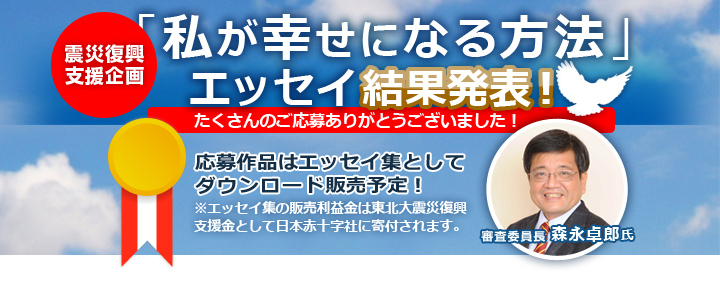 『ネット日本・国民の広場』では、2011年10月1日~2011年12月31日の間、東日本大震災復興支援を目的としたエッセイ募集企画(テーマ:「私が幸せになる方法」・審査委員長:森永卓郎氏)を行ってまいりましたが、本日3月1日、エッセイ入賞作品13作品が決定いたしましたので、入選者ならびに入選作品の発表を行わせて頂きます。(なお、多数ご応募頂きました作品の中から、100作品を選び、エッセイ集100選として、後日iPhoneならびにandroidアプリを作成ならびにダウンロード販売を行います。経費を差し引いた販売利益金は、震災復興支援金として日本赤十字社に寄付致します)