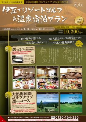 ゴルフ場やホテル・旅館等の運営&運営受託を通してリゾートの再生・活性化を手掛けるリゾートソリューション株式会社(略称:リソル、東京都新宿区、平田秀明社長)の直営ゴルフ場のひとつ「大熱海国際ゴルフクラブ」(静岡県伊豆の国市)ではリソルの各種会員向けに、ゆったり温泉宿に泊まって温泉と食事を楽しみながらゴルフプレーをする『伊豆でリゾートゴルフ&温泉宿泊プラン』を企画。平日プランであれば10,200円~というリーズナブルな料金設定で3月11日(日)から7月13日(金)まで開催します。