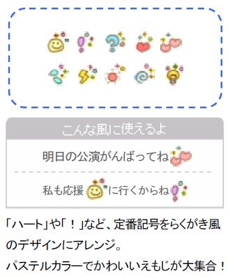 コンテンツ内容:「ハート」や「!」など、定番記号をらくがき風のデザインにアレンジ。パステルカラーでかわいいえもじが大集合!