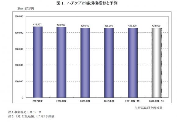 本調査におけるヘアケア市場には、毛髪業市場、植毛市場、発毛・育毛剤市場、ヘアケア剤市場が含まれる。このうちの毛髪業市場とは、かつら・増毛および育毛・発毛サービスの提供やそれに伴う商品販売などを指す。