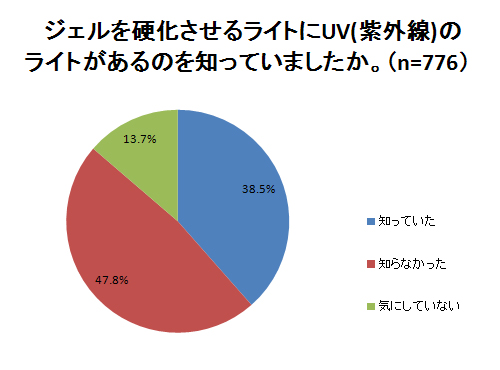 ――ジェルを硬化させる時に使用するライトに紫外線が使用されていると知らない女性が61.5%となり、UV(紫外線)ライトを認知していない状況が浮き彫りになりました。