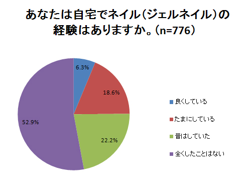 まず、セルフネイルとネイルサロンの経験者で比較するとセルフネイル経験者47.1%、ネイルサロン経験者30.6%で、セルフネイルの方が、経験者が多い結果になりました。