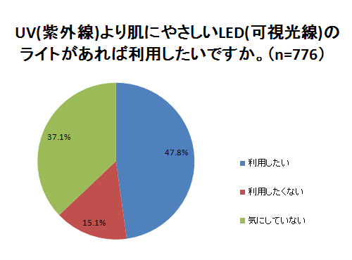 ――UV(紫外線)より肌にやさしいLED(可視光線)ライトがあれば47.8%の人がLEDライトを利用したい結果となりました。美容・健康に意識の高い女性の利用傾向が反映されることが明らかになりました。