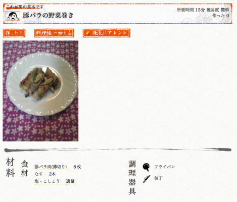 利用者は、自分が作成したレシピや気に入ったレシピを「俺の料理帳」に追加することができます。気に入ったレシピで「作った」ボタンを押すと、自分の料理帳に「作ったアイコン」が表示され、モチベーションを高めることができます。また、「俺流にアレンジ」機能を使って、他人が登録したレシピを自分好みに変更することができます。なお、料理帳機能を利用するには、ユーザー登録またはTwitterアカウントかFacebookアカウントによるログインが必須となります。